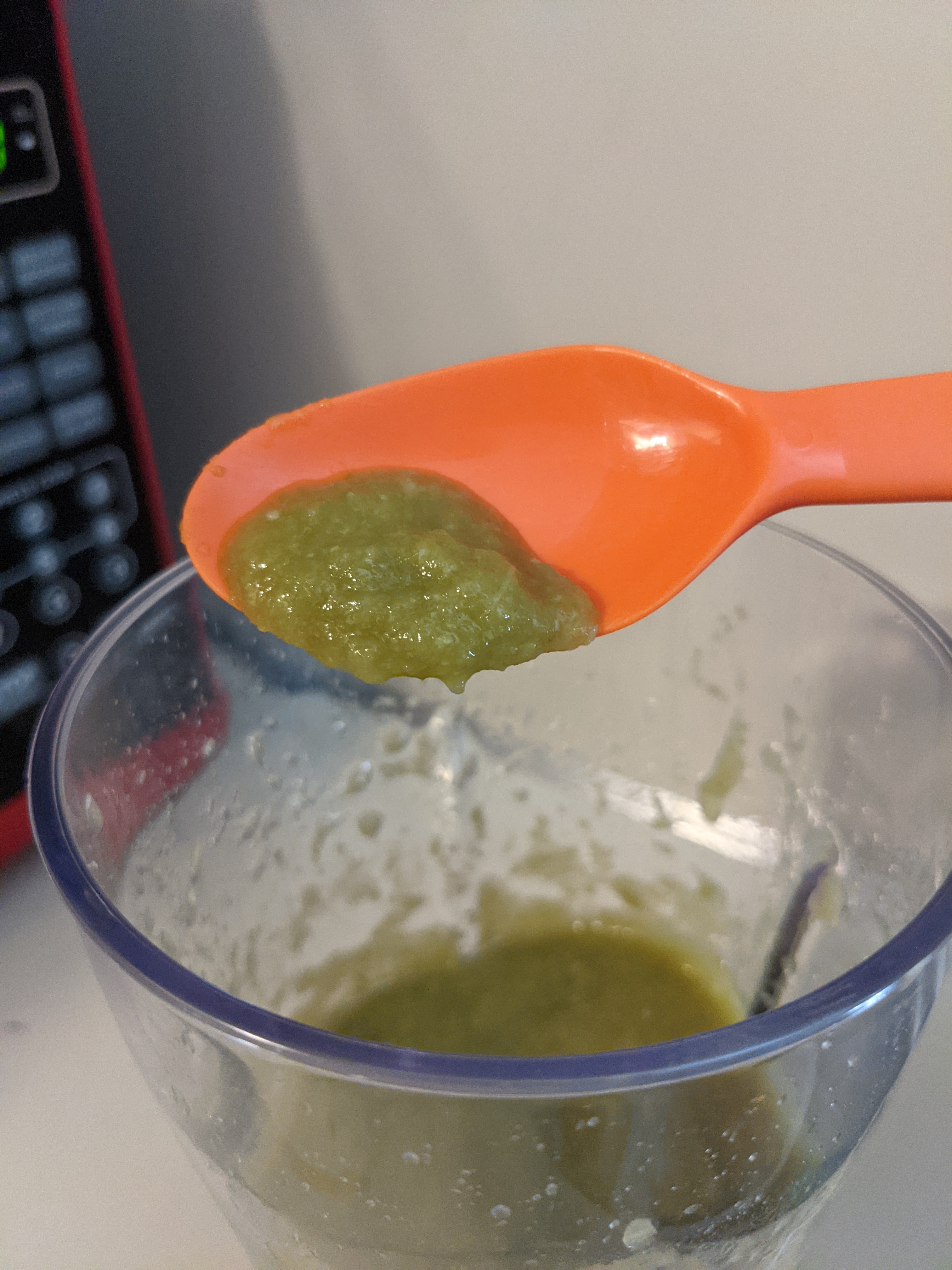 I know I already used a steamer bag before with the butternut squash, but green beans are a pain to cook. To get them soft enough to blend them well, they have to be boiled into oblivion which is not helpful during a summer heat advisory. After following the steaming directions and letting the beans cool (just like with the squash previously), add about half of the cooked beans and some water to the blender and pulse. Green beans are grittier than squash and the texture is a bit like apple sauce. It isn’t smooth, and some babies don’t like green beans at all. In preparation for babies who might redirect the green beans to your face with gumption, have applesauce handy to make the beans more palatable. Pour the unsweetened applesauce and the other half of the steamed beans into the blender and make that little gadget buzz again. The addition of the applesauce slightly alters the texture and consistency and definitely improves the sweetness level. I know this personally because I ate the mix on the spoon above. It tastes much closer to applesauce than green beans, but with all the goodness of both. If you want to assure Baby that you eat these green things too, I’d make sure your cup has this mix in it. For reference, that one steamer bag combined with one half cup container of applesauce filled two restaurant soup containers three quarters of the way to the top. I know Baby won’t eat all of that in a week. I know I can’t eat that much green beans in a week, so check back in a day or two and read about how to freeze larger batches.