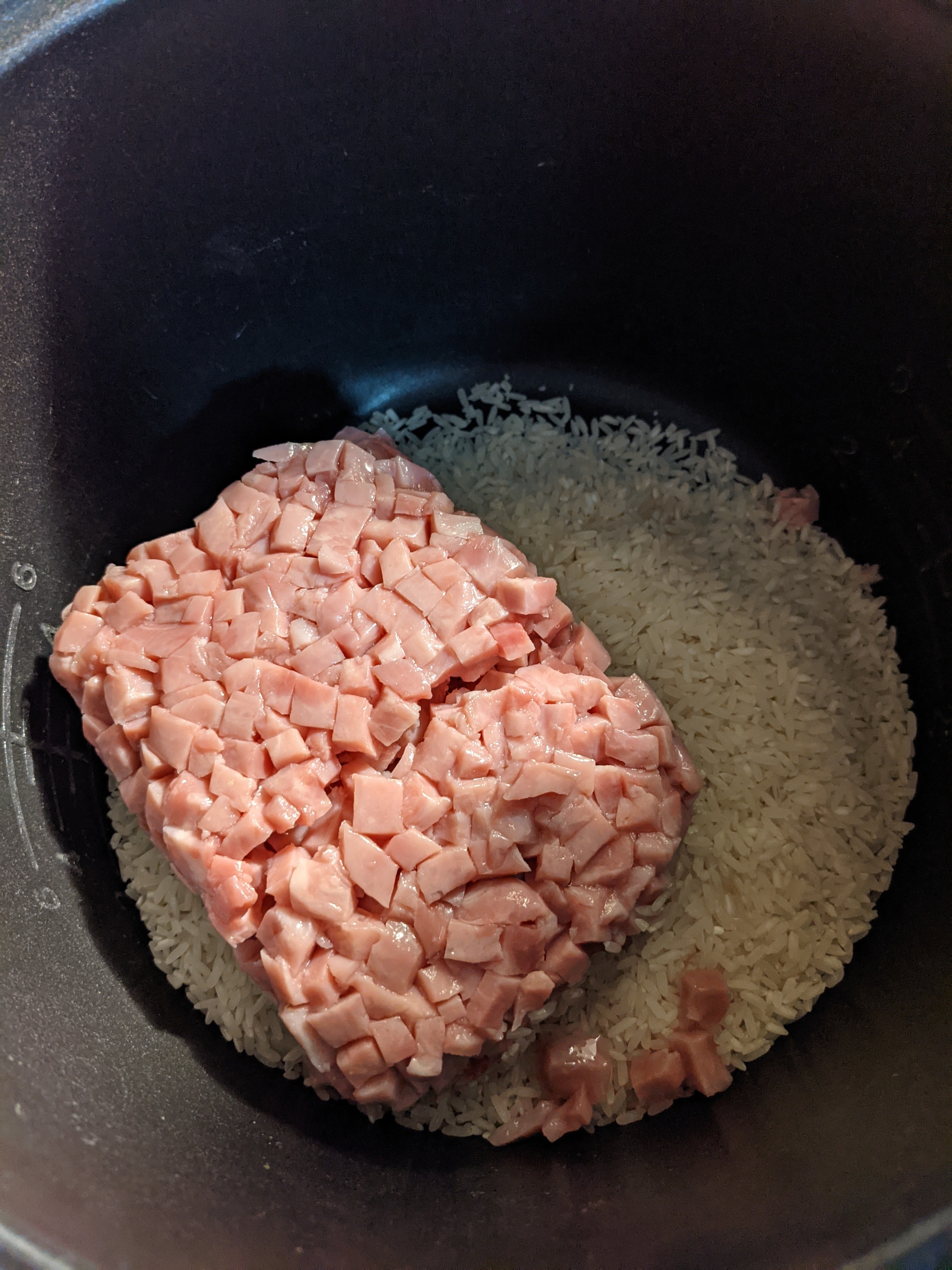 Step 2- Tear open the bag of ham and pour the ham over the rice.