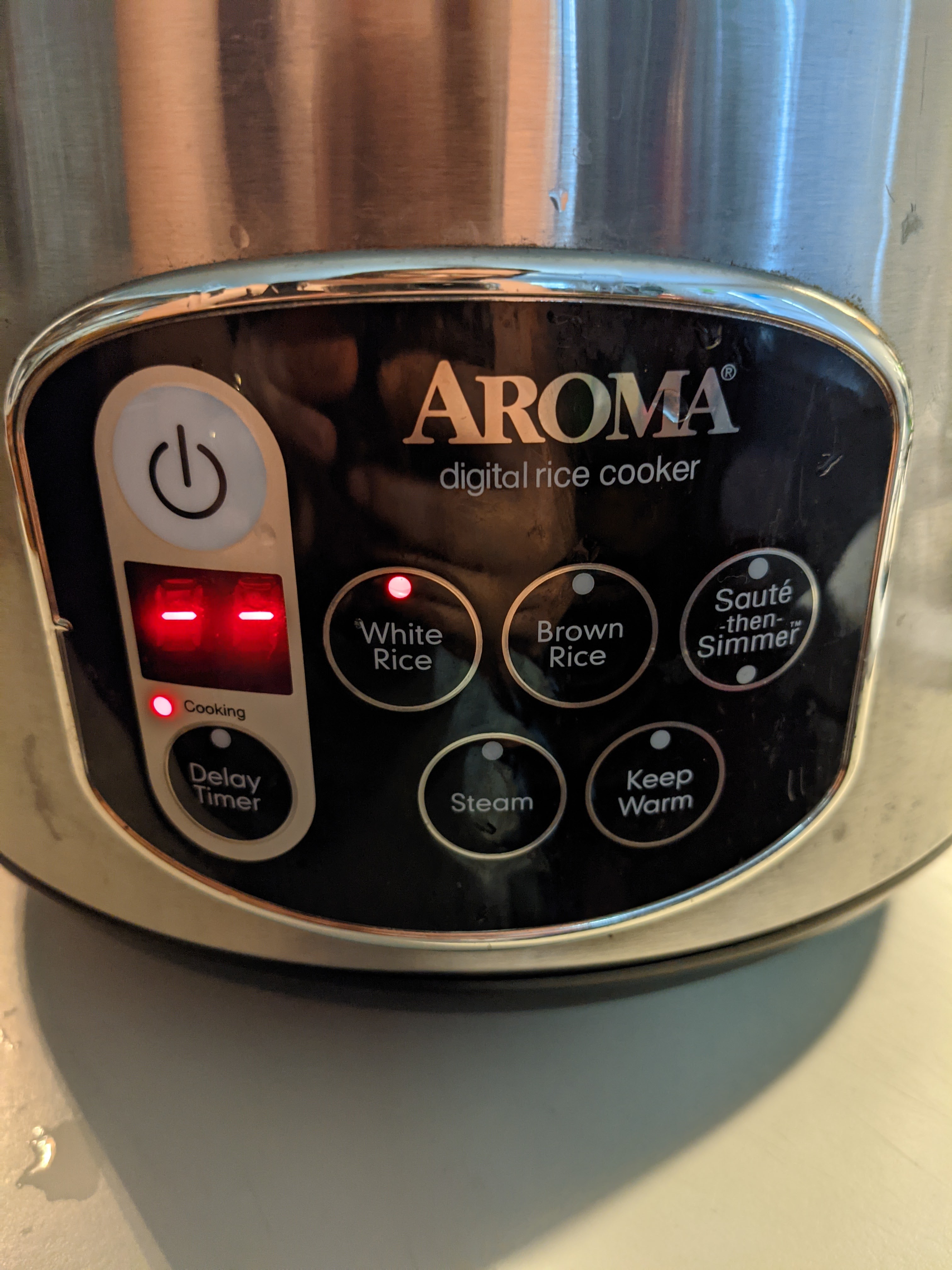 Step 7- If your rice cooker just has an on/off button, just press it. If your cooker looks more like mine, click power and then white rice.