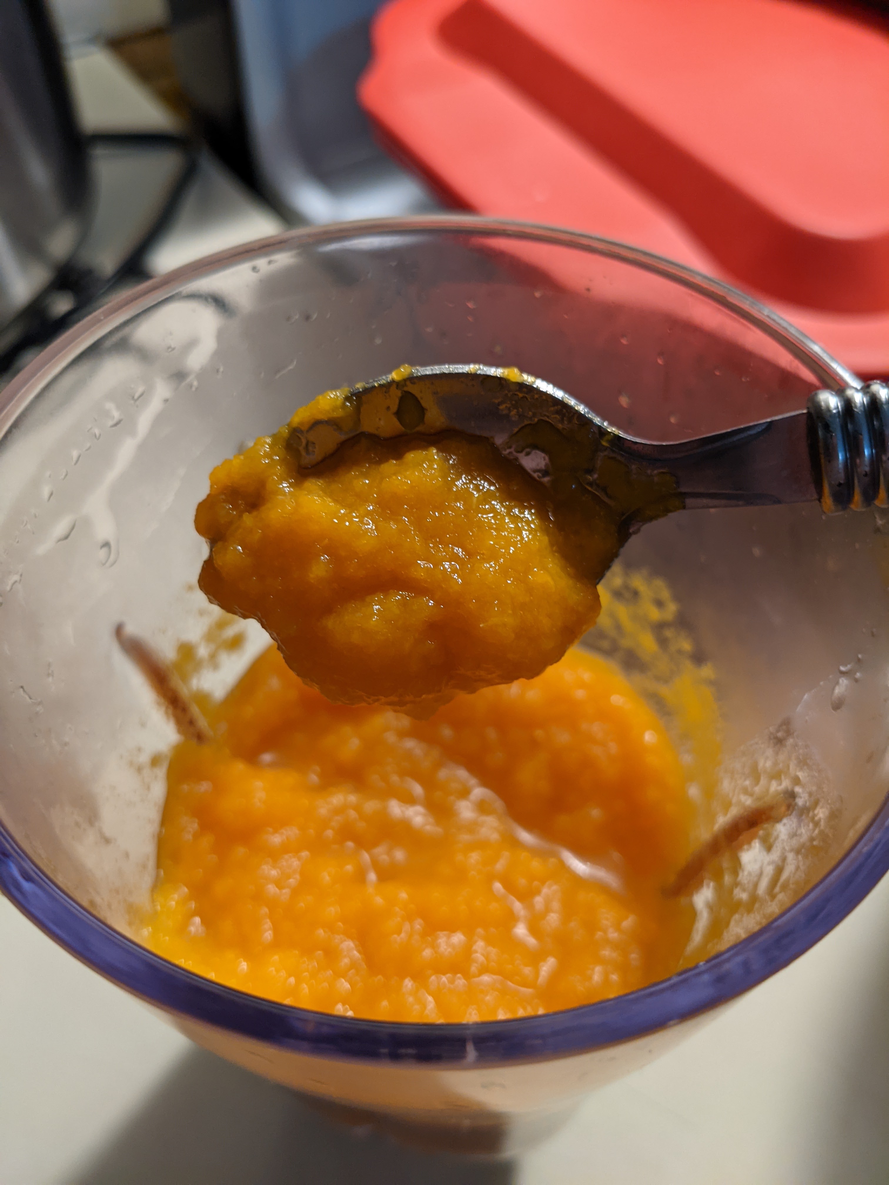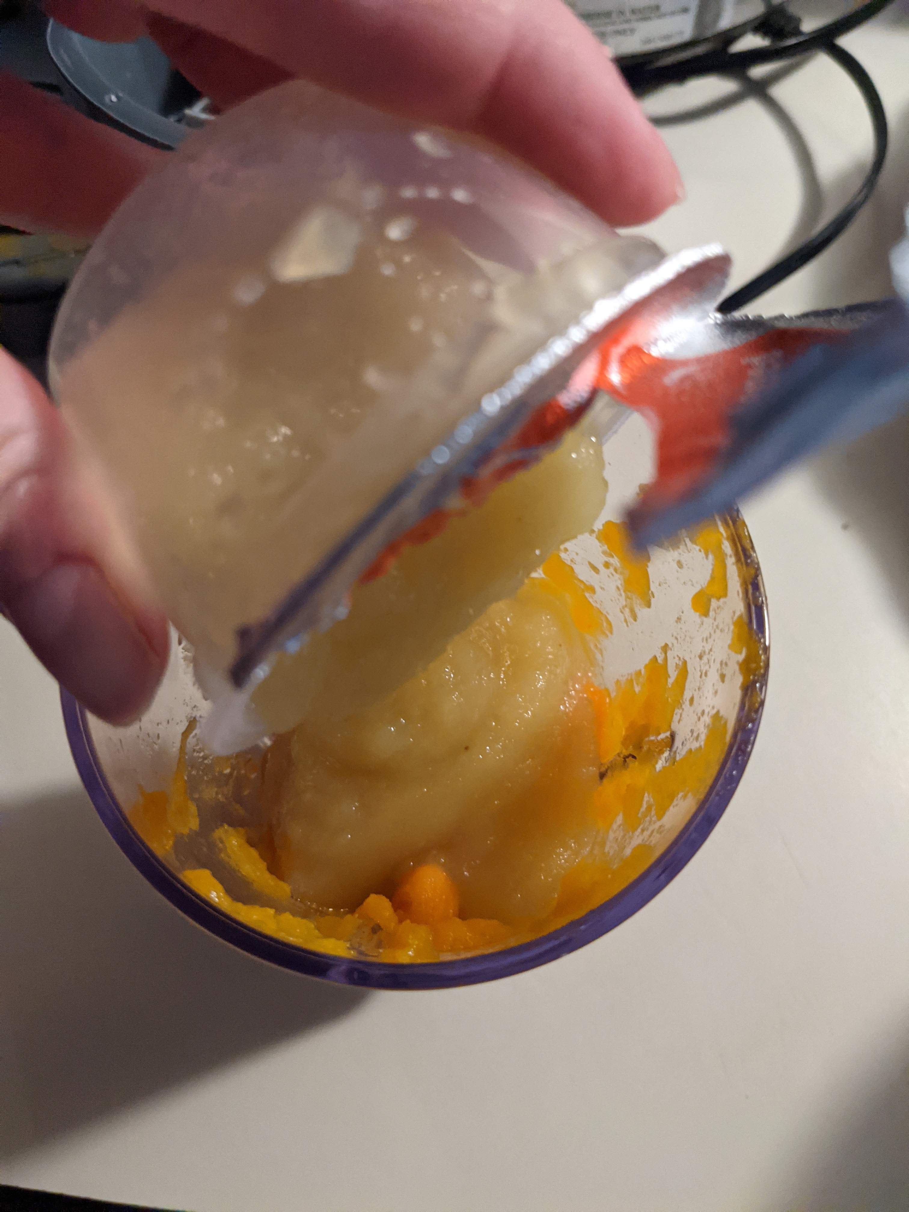 We’re in month seven now, and Baby may be eating closer to a fourth of a cup or more now at each meal. Each cube of frozen baby food is about a tablespoon, so every four cubes is about a fourth of a cup. If two cubes just doesn’t seem like enough but a full fourth cup is too much, just use three cubes and hit the middle. At this point, some babies are ready to move to three meals a day, averaging anywhere from 3/4 to 1 and 1/4 cups of baby food, in addition to their chest milk/formula. Trust your gut. If Baby still seems hungry, Baby probably is. We’re also going to try some legumes and bean this month and see how Baby feels about complex carbohydrates!