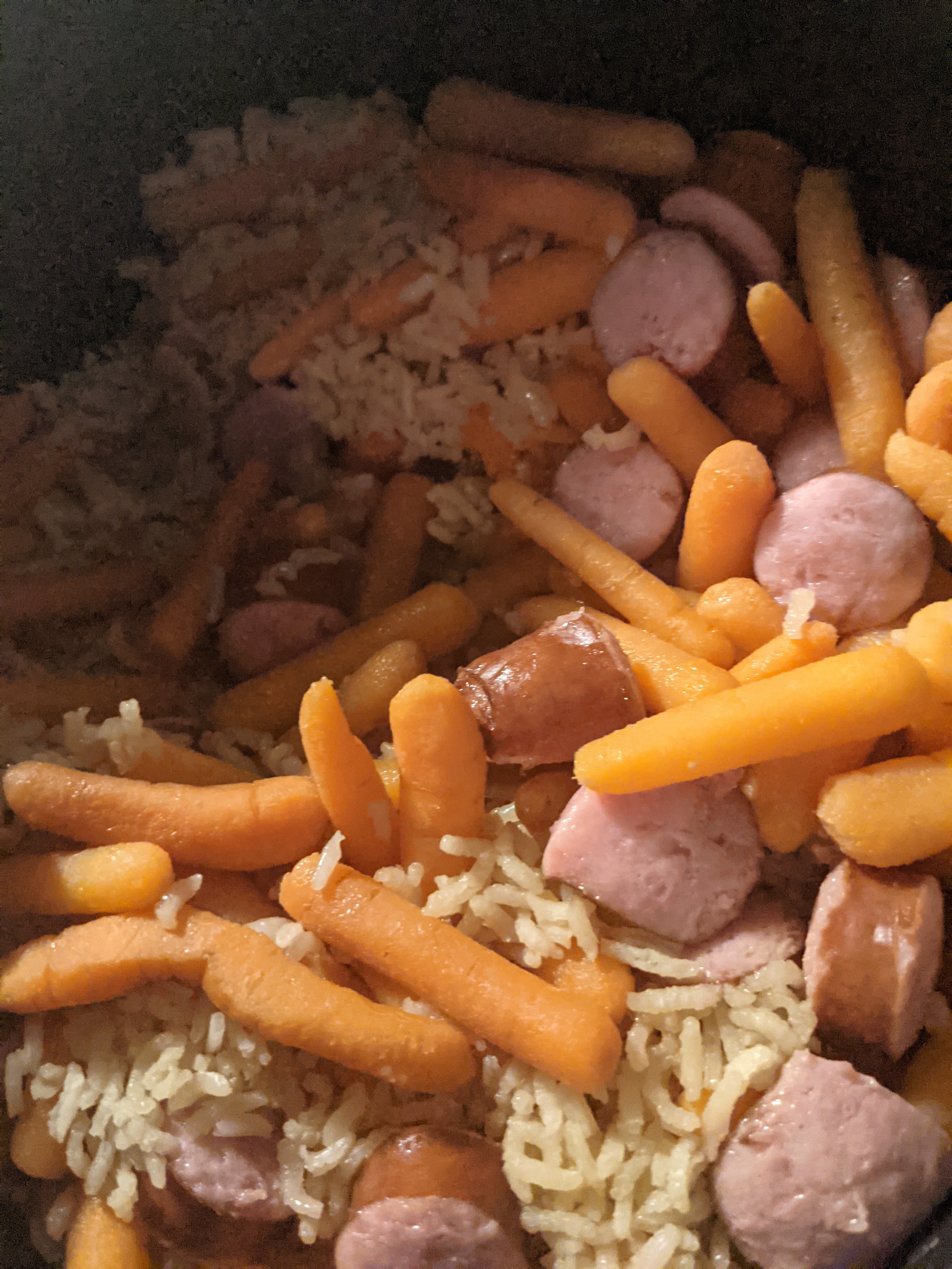 A couple of months ago, I shared how to make Ham and Carrot Bowl. This is a slightly more complicated version because a knife is needed. Other than exchanging the ham for a package of smoked brats (doesn’t have to be brats, can be kielbasa or smoked sausage as well), the recipe remains the same. I really do believe that knowing how to cook is essential to feeling independent and being independent, but cooking needs to be what you need it to be. It’s like exercise: it’s important to life, but you probably won’t keep up with it if you hate the type of exercise you’re doing. I utilize shortcuts and instant foods all the time. It is not being lazy or cheating, and it really bothers me when people talk about alternative routes to the same end result as if they were a bad thing. Suggesting that using a trick or convenience method is somehow not “real cooking” or less legitimate is degrading and insulting. It also discourages people from learning to cook in the ways that work for them. I make pancakes from a box. My husband makes pancakes from a recipe. Either way, pancakes end up on the table and our children devour them. Everyone is fed and neither of us wants to scream, because we cook in the ways that work for us without shame. Cooking is cooking and we should be proud of it! In the photos below, you’ll see that my son made this dish. I carefully chose the ingredients, just like with the Ham and Carrot Bowl, to be exact so that frustration with measuring and spilling wouldn’t leave him feeling defeated. Other than giving verbal instructions and some physical redirection for safer knife skills with his hands, I took the photos and nothing else. Other than using a knife, which isn’t absolutely necessary, this is one of the most accessible recipes I know and also one of the most comforting. Add the rice to the rice cooker bowl.Then add the carrots. Slice the brats how you like. If you don’t want to slice, feel free to dump them in whole. They will cook this way and can be broken up later, if you want. It’s ok to pick one up with a fork and eat it triumphantly!Pour in the broth.Add a little olive oil, if you’d like, to soften the rice and help it come loose from the sides of the rice cooker after cooking. Sometimes, we don’t. The crunchier rice on the sides of the pot can be quite yummy.There were no leftovers. 🙂