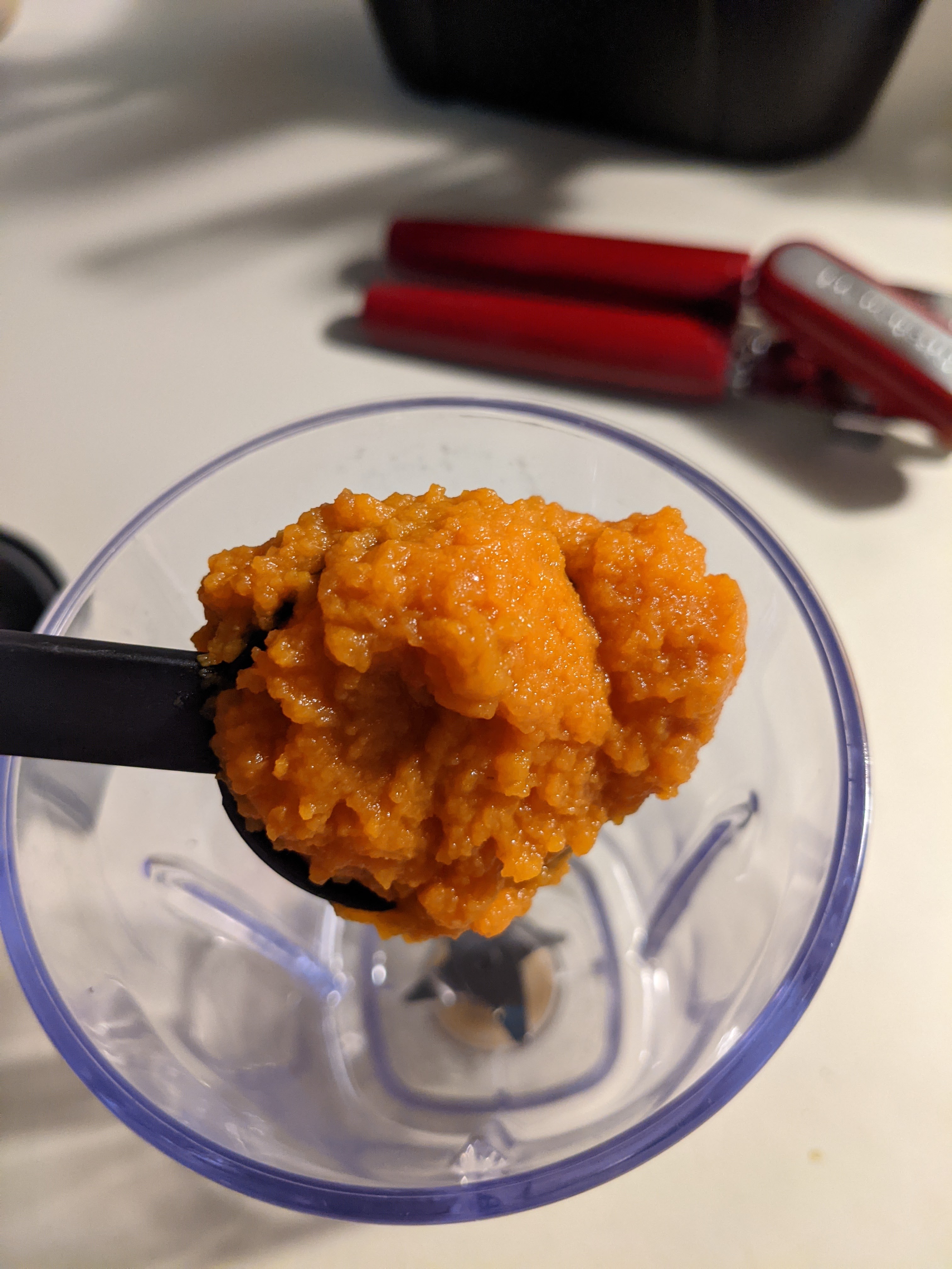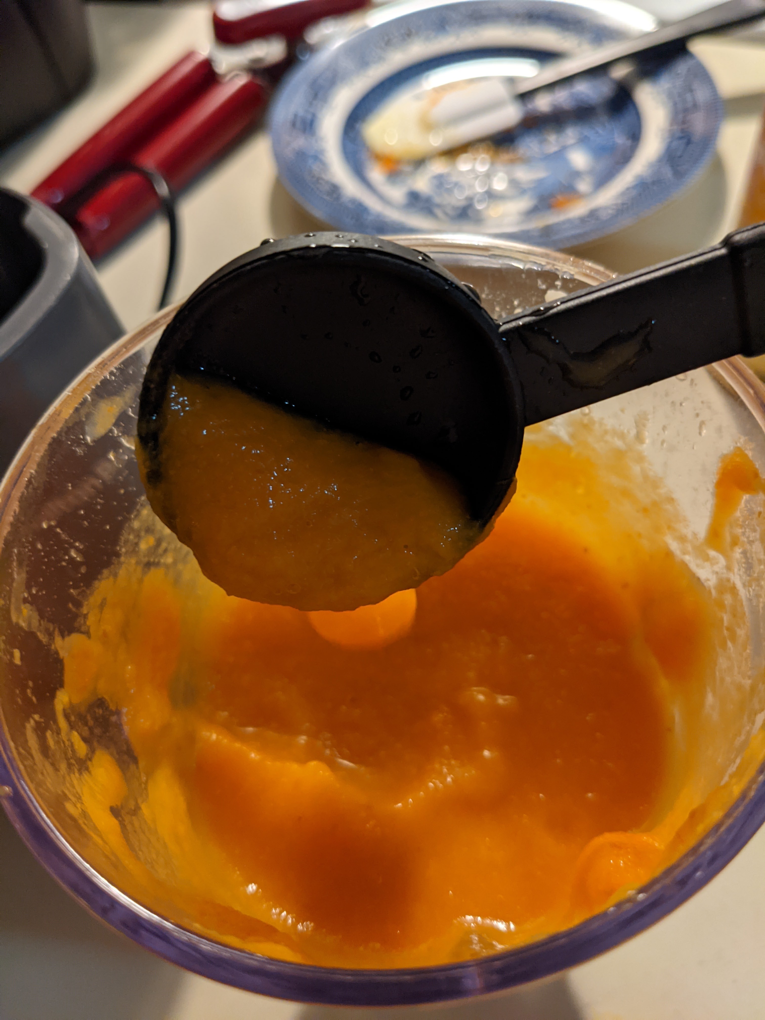 It has been weeks since I shared any baby food recipes, and I’m genuinely sorry for this delay. Hopefully the ease of this particular preparation and its seasonal relevance will make up for my neglect. Please do not buy a pumpkin and disembowel it. Preparing fresh pumpkin is a lot of work and completely unnecessary for making homemade baby food. Canned pumpkin is all you need. This has even less preparation than frozen mango which needs to be defrosted before being blended. Canned pumpkin is ready as is and needs only to be blended with water to reach a desired consistency.