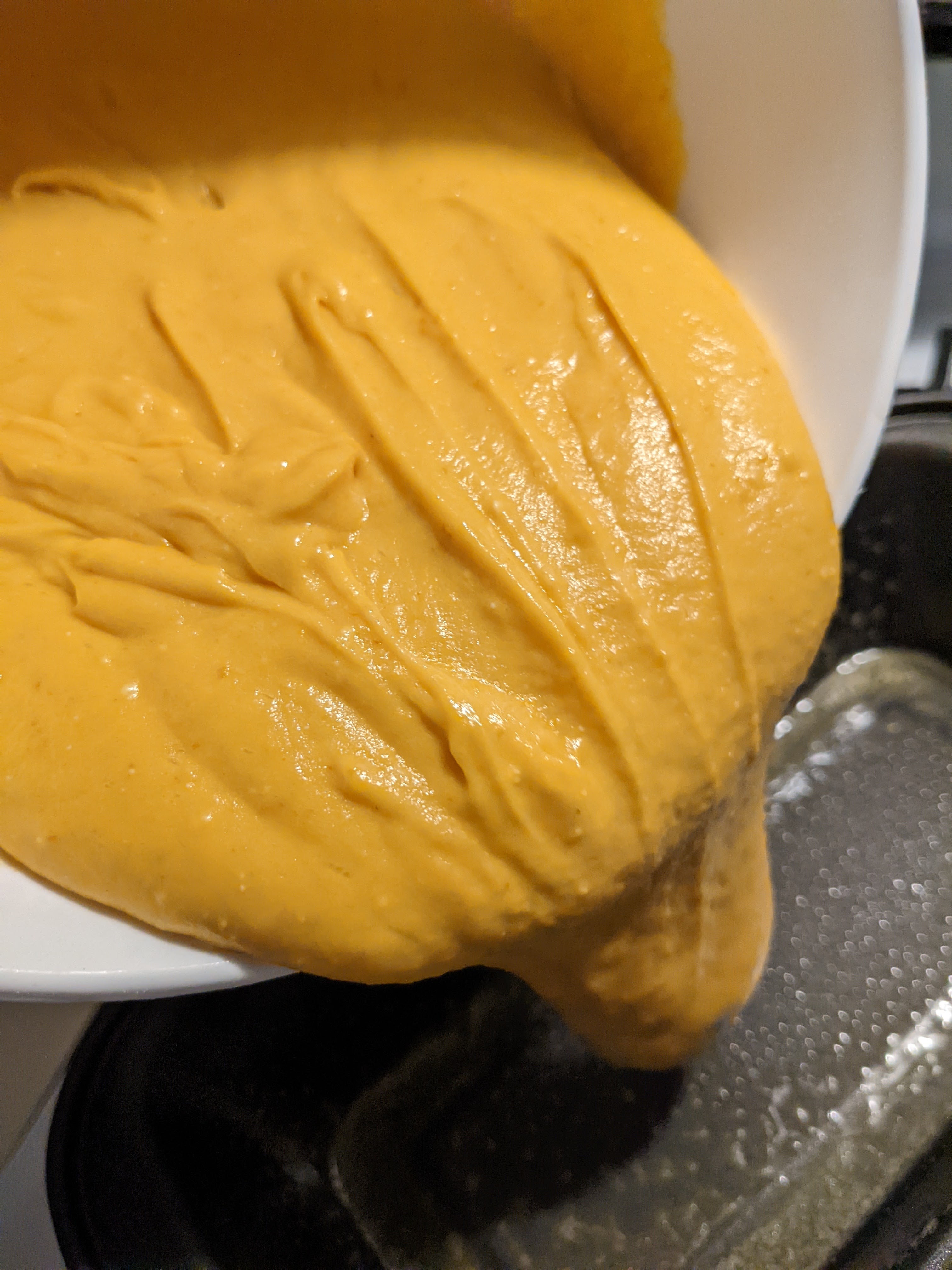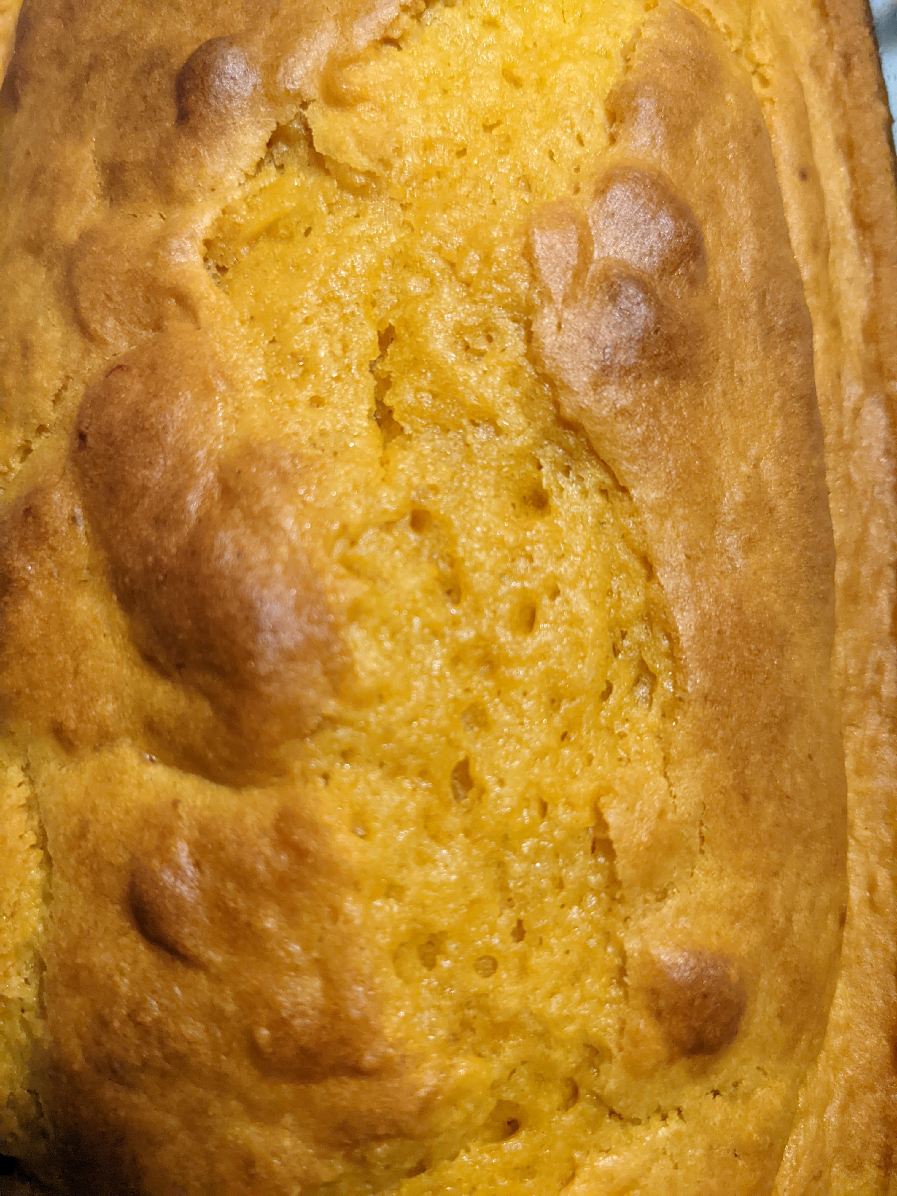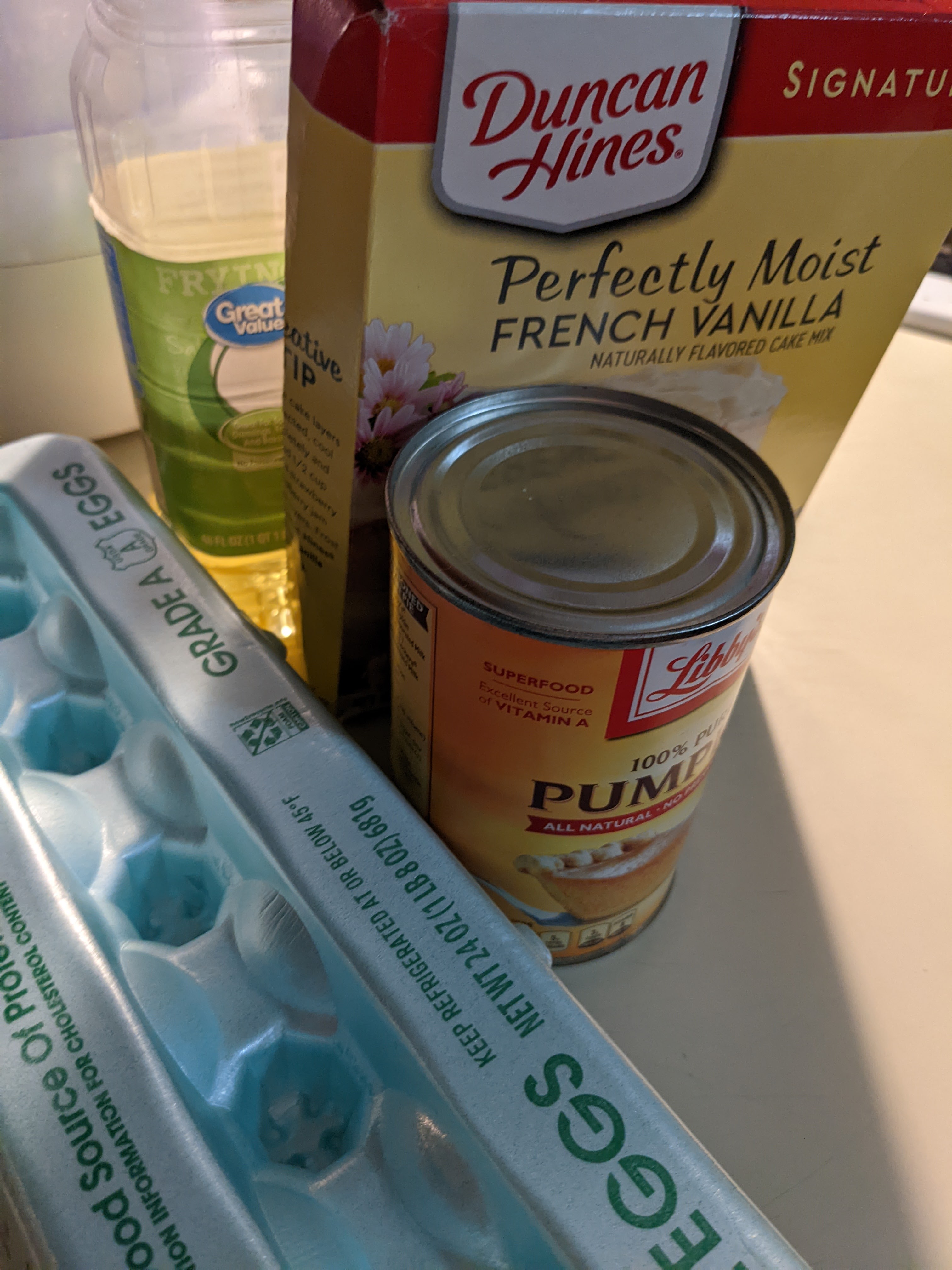 The last time I made bread, I made pink banana bread with sprinkles. Today, I’m using the same idea to make pumpkin bread. This is a 4 ingredient recipe. 5, if you include the baking spray. I don’t bake much, honestly. When I do, I need it not to exhaust me. Cake mix saves me the hassle of measuring out flour, sugar, baking powder and whatever else is needed. Less dishes and less to keep track of—just much better for me. Unlike bananas, I do find that pumpkin doesn’t work with every cake mix flavor. For some reason, this French Vanilla version is not ok with my youngest., but his brother wanted to eat the entire loaf by himself. Pumpkin is a preference, I guess. Either you love it, or you don’t. My oldest has been eating pumpkin bread since he could say Starbucks. I can make two loaves of pumpkin bread for less than the price of one slice there, so when I have the energy, I do. One can of 100% pumpkin, one box of cake mix, 3 eggs, and 1/3 cup of oil. That’s it! It’s not overly pumpkiny, but still possibly too pumpkiny for one who loathes anything pumpkin.Preheat your oven to 350 degrees and then dump the pumpkin in first.Then add 1/3 cup of oil.Mix together.Add three eggs and mix again.Add the cake mix in and mix some more.It comes out thick and goopy.Spray or butter your pan down for easy release.Pour into two bread pans and bake at 350 degrees for approximately 50 minutes.Nice and golden!It really was delicious and took less than 5 minutes to prepare this morning. I highly recommend!