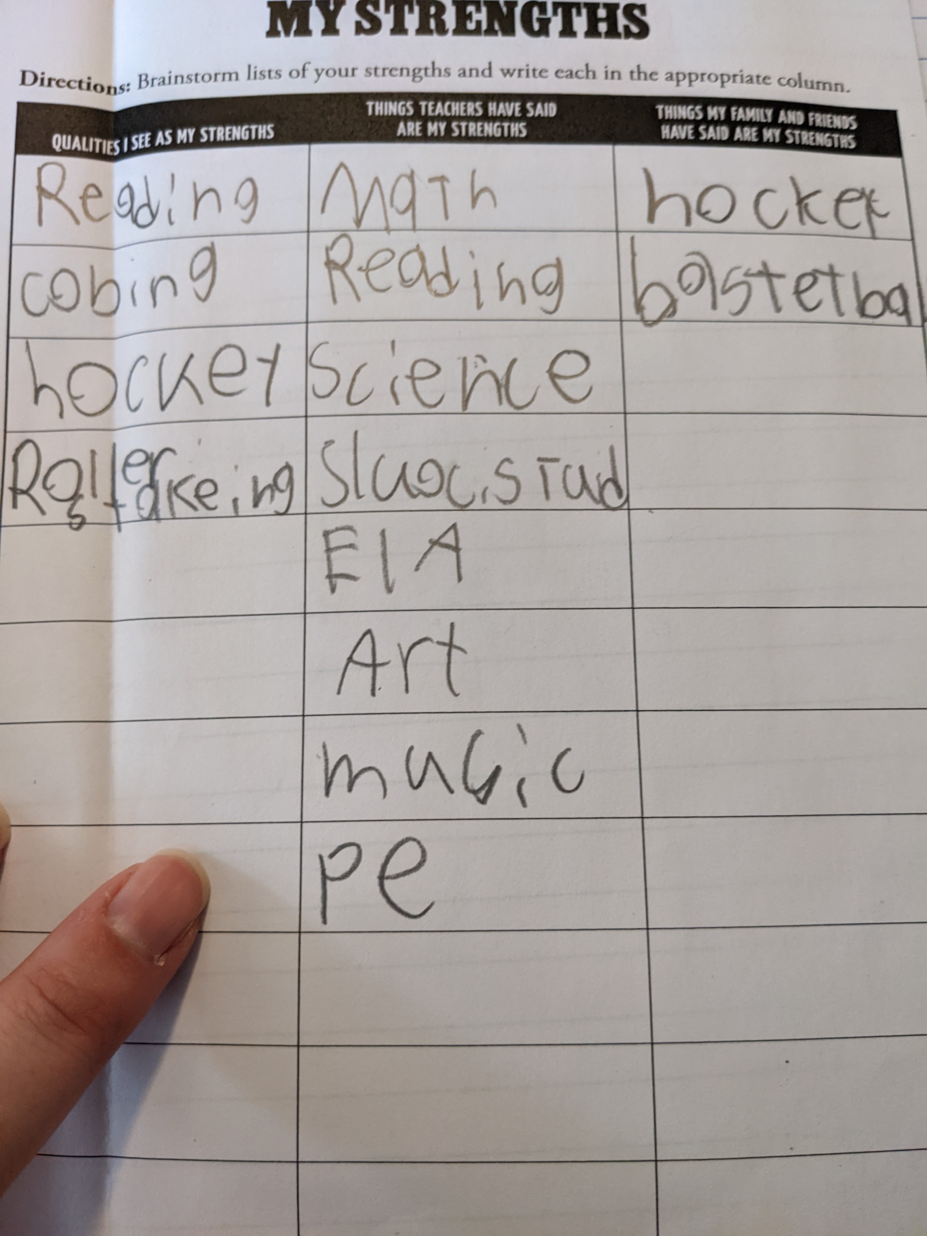 I found this inside my son’s first semester journal. Once weekly, he attends a different school with other kids a little more like him, and changes teachers each semester. This gives him the stability of his home school and all it has to offer, plus exposure to a variety of teachers and students between both schools combined. It’s such an important skill to identify that the things you believe you are good at aren’t necessarily the same things that others believe are good about you. Not only does this chart help him identify what he likes about himself in comparison to what others like about him, it validates the understanding that you can like yourself outside of the approval of others. It is helpful to recognize how others see you, but it is not the only lens through which to see yourself. We might all benefit from filling out a chart like this from time to time.