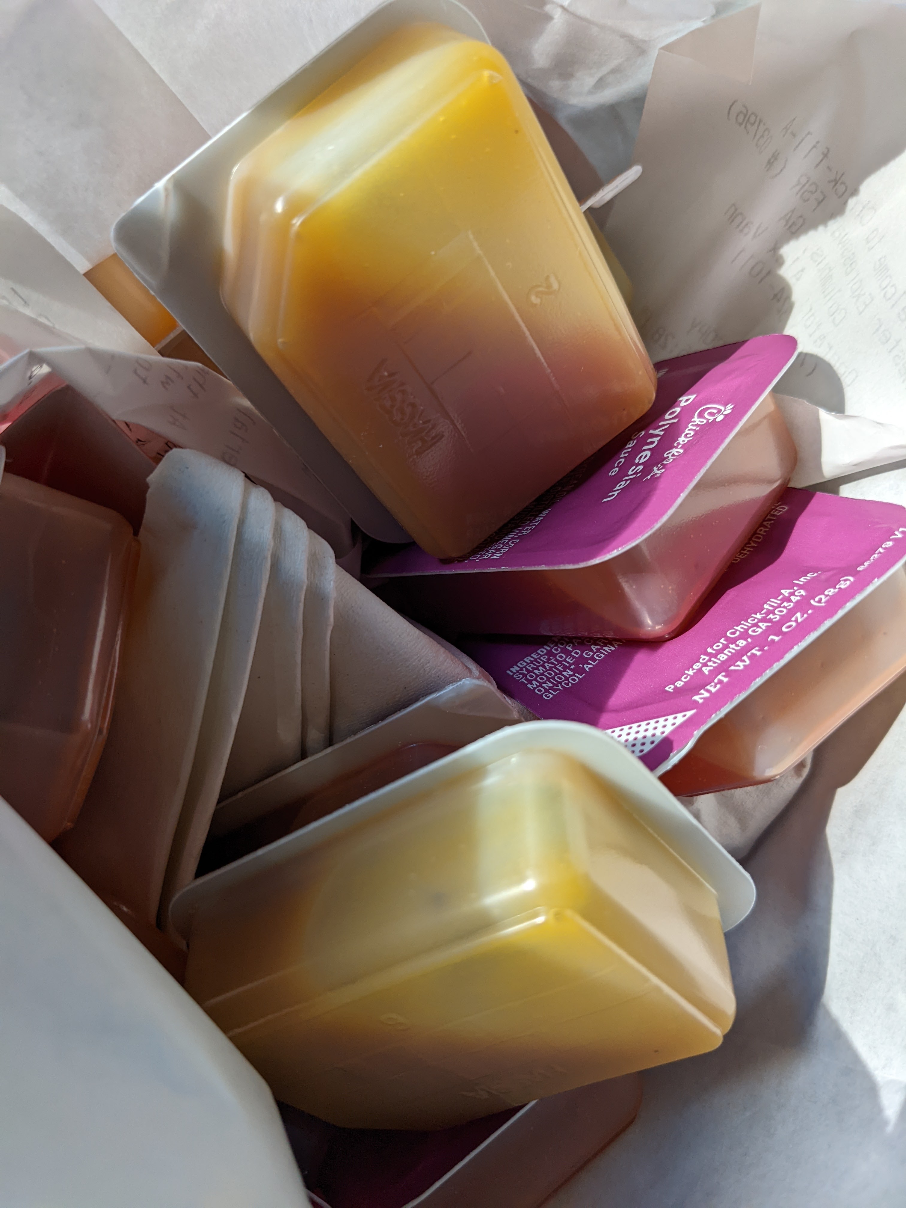 Georgia is known for many things. People raised here don’t understand a world without Chick-fil-a. Chick-fil-a embodies some of the best and some of the worst things about southern culture. This photo is tangible evidence of the southern expectation that apologies be attached to something physical, proof that the expression of remorse was meant in earnest. In other words, if an apology was needed, an unspoken debt was likely created. When that debt is repaid, the apology is deemed legitimate. Some might say this perspective is from an older generation and it’s gradually lessening, but I’ve seen the embarrassment on mothers’ faces when they were scolded because their daughters didn’t send thank-you cards for wedding gifts within four weeks of the wedding. Debts take many forms here. Chick-fil-a asked me to park to the side and wait for my nugget meals. I didn’t even wait long enough to finish a one sentence text on my phone before I was greeted with a giant smile, several apologies, the classic and corporate required “my pleasure”, and a mound of sauces. There was no debt, merely the belief of one. Of course, I appreciated having extra sauce because I do love to dip my waffle fries, but it feels a bit sad that we live in a world where it’s not ok to wait a couple of minutes for some food without expecting to be reimbursed for that slight delay.