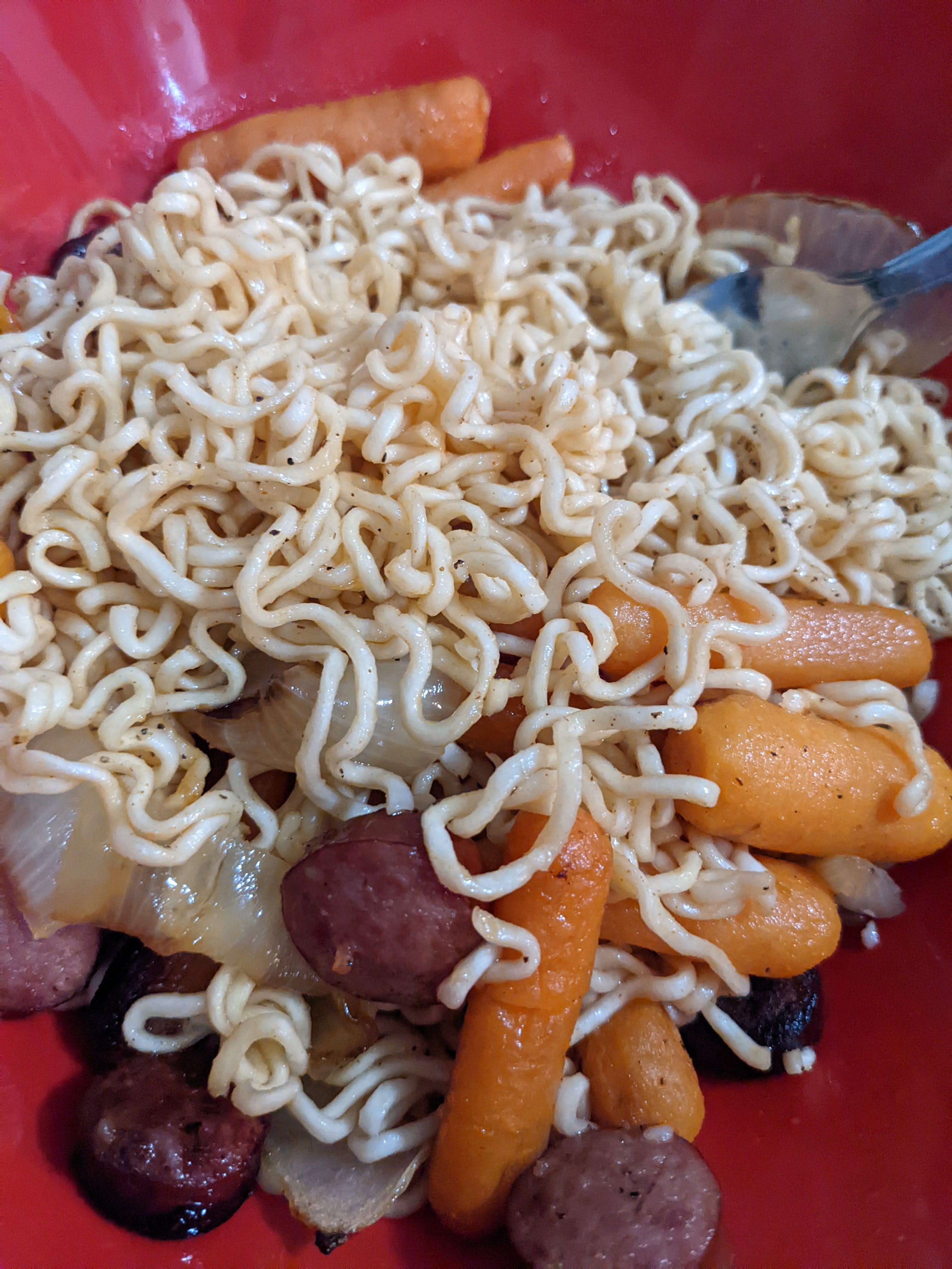 In my opinion, basic ramen packs should not be underestimated. With an electric kettle (if you don’t have one, consider getting one) providing boiling water in less than 5 minutes, ramen can be made in under 9 minutes. When you add the leftover roasted veggies and sausage from the night before to drained noodles and pour some tasty Chick-fil-a Polynesian sauce packets over it, grabbed from the anything drawer, you’ll find a bowl of yummy. It’s not fantastic or restaurant quality by any means, but it is affordable, convenient, and a resourceful way to use up leftovers, thus making your money go further and helping to reduce waste in the process. I save those flavor packets from the ramen bricks and use them later to make broth for other dishes or to season more roasted vegetables. Cooking doesn’t have to be exhausting. Cooking needs to be what you need it to be, and sometimes, that’s a bowl of ramen noodles and stuff.